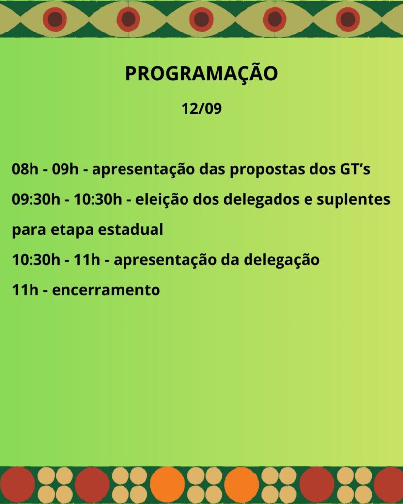 • 09h30–10h30: Eleição de delegados(as) e suplentes (etapa estadual)