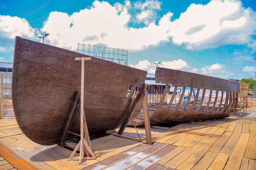 Embarcação histórica encontrada na Nova Doca recebe últimos retoques para ser exibida ao público
