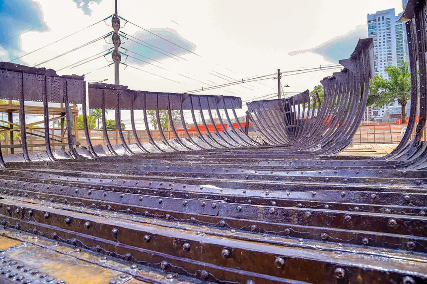 “A maior dificuldade da restauração é a fragilidade em algumas áreas da embarcação. Como a estrutura estava soterrada por muitos anos em ambiente úmido, a corrosão avançou em vários pontos. É necessária uma delicadeza com o próprio material em si, pois suas propriedades ficam expostas ao ar livre. Outro grande desafio foi montar uma estrutura acima do nível do solo onde aconteceria o restauro, devido ao grande peso da embarcação”, explica Tainá Arruda, arquiteta responsável pela conservação da peça.
