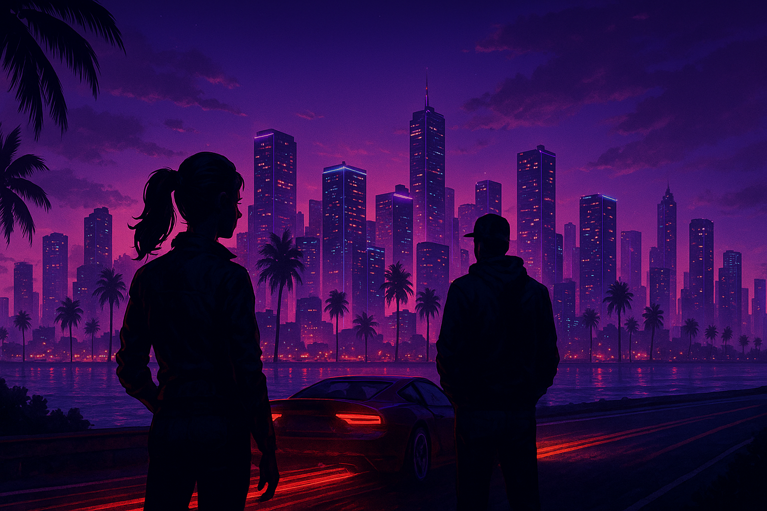 Nos trailers, a volta a Vice City (agora no estado de Leonida) ganha cara de documentário criminal contemporâneo. A campanha acompanhando Lucia e Jason mistura crimes filmados por celulares, lives e TV local — uma leitura de 2020+ com humor ácido típico da série.