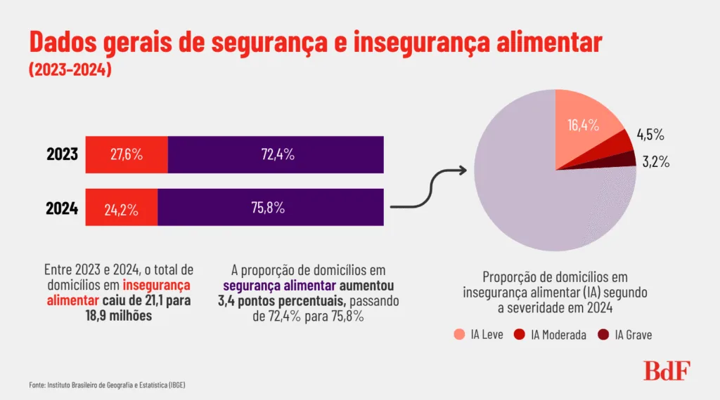 Nos cenários mais graves, a insegurança moderada — redução quantitativa de alimentos entre adultos — caiu de 5,3% para 4,5%. A forma mais severa, classificada como a que envolve menos alimentos também para crianças e adolescentes, diminuiu de 4,1% para 3,2% dos domicílios no período.