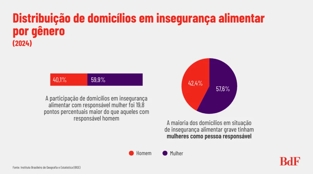 A maioria dos domicílios em situação de insegurança alimentar (59,9%) tinha mulheres como a pessoa responsável. Embora as mulheres sejam responsáveis por 51,8% dos domicílios totais, sua participação nos lares com vulnerabilidade alimentar é 19,8 pontos percentuais (p.p.) maior que a dos homens (40,1%). A falta moderada de alimentos foi o grau que apresentou a maior diferença (61,9% para mulheres e 38,1% para homens).