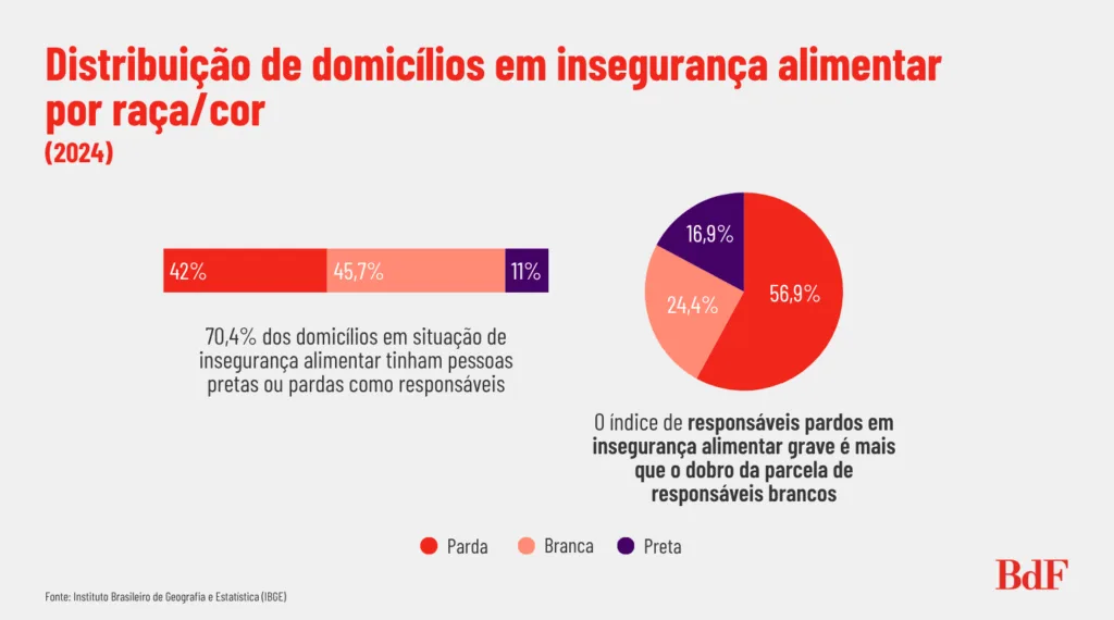 Na perspectiva racial, do total de domicílios em situação de insegurança alimentar (todos os graus), 70,4% tinham pessoas pretas ou pardas como responsáveis. A distribuição desses domicílios em IA era: parda (54,7%), branca (28,5%) e preta (15,7%).