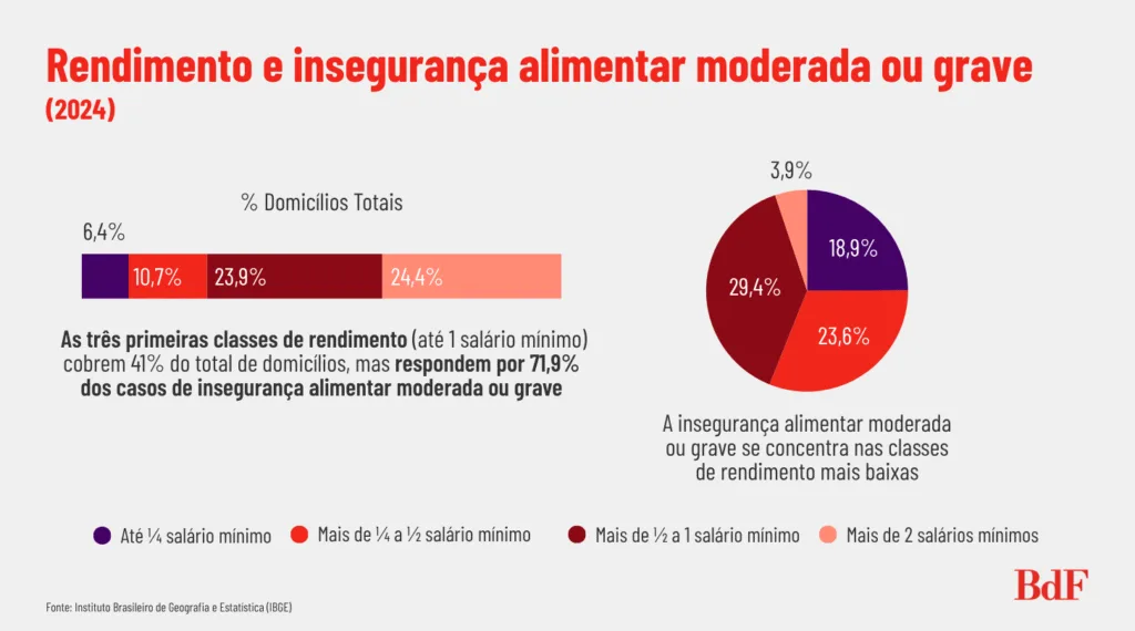 Há ainda uma forte associação entre baixa escolaridade do responsável e insegurança alimentar, assim como o baixo rendimento. Os domicílios em escassez alimentar moderada ou grave se concentraram nos grupos com renda per capita de até um salário mínimo. Eles correspondem a 41,0% do total de domicílios do país, mas são 71,9% dos casos de fome moderada ou grave.