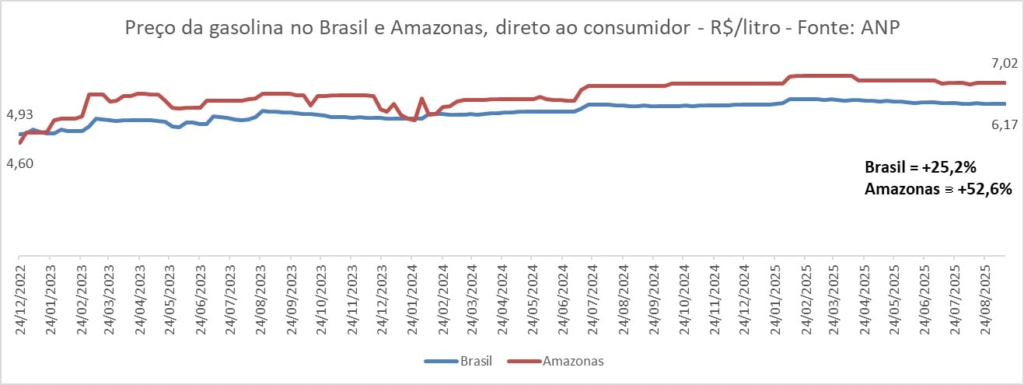 A situação se reflete no bolso dos consumidores da região, que pagam os maiores valores do país por combustíveis como gasolina, diesel, etanol e gás de cozinha. Um comparativo feito pelo Departamento Intersindical de Estatística e Estudos Socioeconômicos (Dieese) com base nos dados da ANP mostra que o preço da gasolina no Amazonas, por exemplo cresceu, entre 2022 e agosto deste ano, 52,6%, enquanto a média nacional do mesmo período cresceu 25,2%.