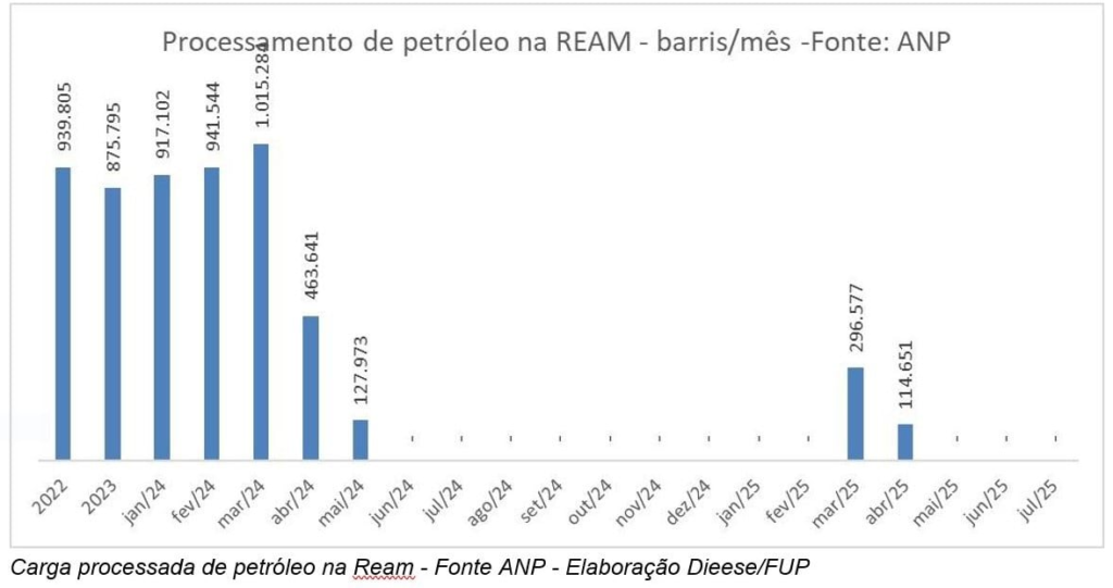 Em 2022, a Ream refinava, em média, mais de 900 mil barris de petróleo por mês. Desde o ano passado, deixou de produzir combustíveis e agora funciona apenas como base logística. Em 2025, a unidade processou petróleo apenas em março e abril, em quantidades muito abaixo da média, de acordo com dados da ANP compilados pelo Dieese.