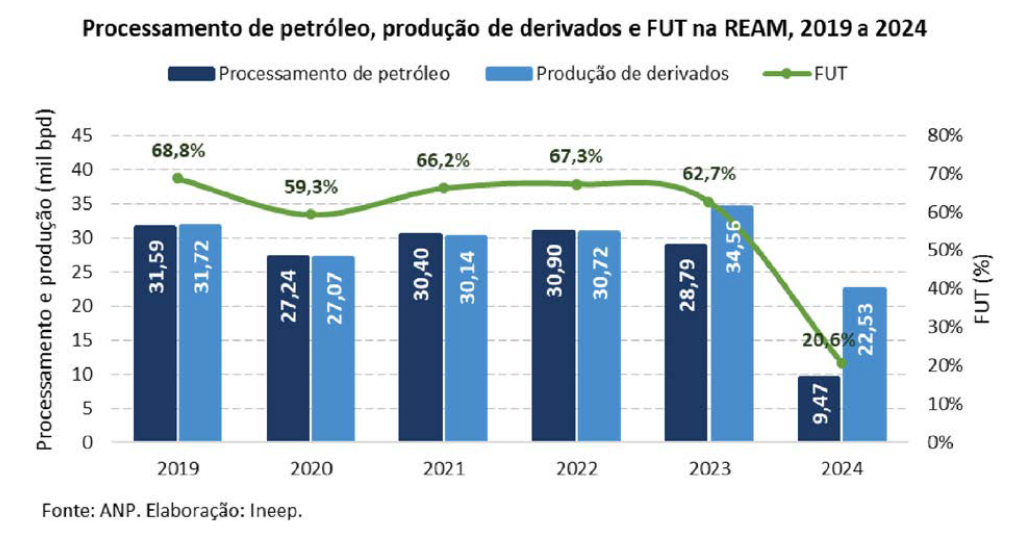 Desde a privatização, a Ream passou a operar com capacidade cada vez menor. Em 2022, quando ainda era estatal, a refinaria utilizava 67% de sua capacidade. Em 2024, esse número caiu para pouco mais de 20%, segundo dados do Ineep. Mesmo assim, o Grupo Atem se manteve como principal ofertante de gasolina e diesel no Amazonas.