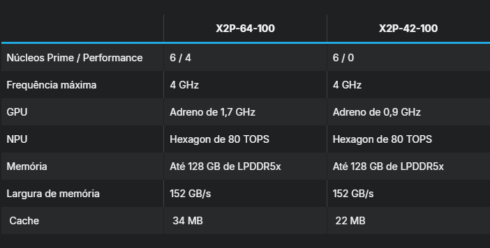 Dois modelos compõem a linha. O mais avançado é o X2P-64-100, que tem dez núcleos de CPU, seis dos quais são de alto desempenho (Prime). Eis os principais atributos de cada modelo: