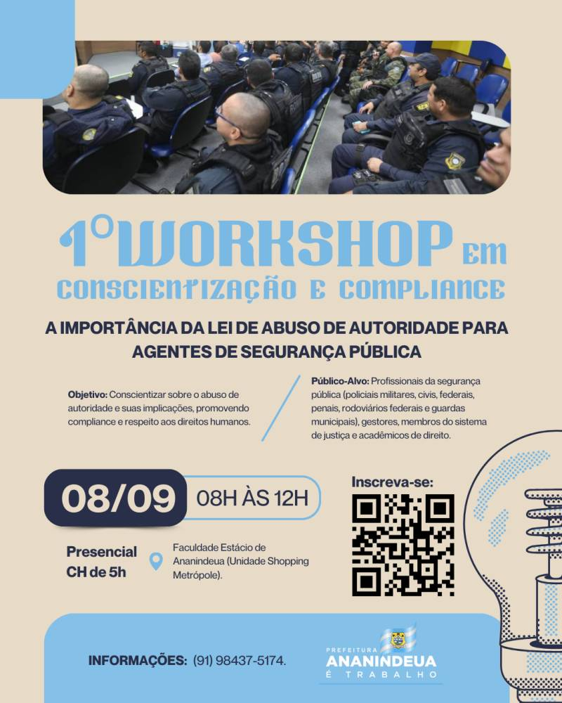 Na próxima segunda-feira (08/09), Ananindeua será palco do I Workshop em Conscientização e Compliance: A Importância da Lei de Abuso de Autoridade para Agentes de Segurança Pública. O evento será realizado na Faculdade Estácio, unidade Shopping Metrópole, reunindo profissionais da segurança pública, representantes do sistema de justiça e acadêmicos de Direito.